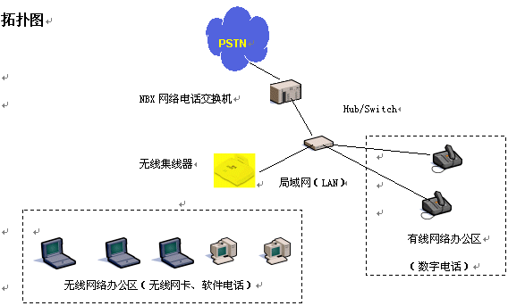 公司有大約有50人辦公流動(dòng)性較大,經(jīng)常出差,辦公位置不固定,每人配備一臺筆記本電腦。在電腦中安裝無線網(wǎng)卡和軟件電話,他們可以在公司的任何地方連接局域網(wǎng),使用筆記本電腦訪問數(shù)據(jù)資源,撥打、接聽電話。