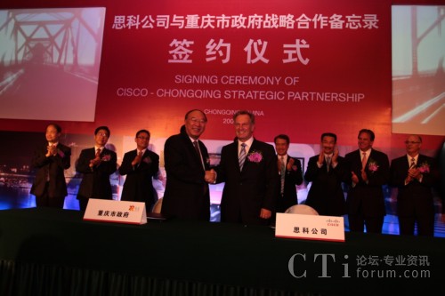 CTI論壇(ctiforum)9月14日消息:2009年9月11日,重慶市人民政府與思科正式簽訂合作備忘錄,雙方將結(jié)為戰(zhàn)略合作伙伴關(guān)系,就通信產(chǎn)品制造、“智能+互聯(lián)城市”試點示范、綠色技術(shù)研發(fā)與創(chuàng)新及風(fēng)險投資等多方面展開深入合作。此次合作將進(jìn)一步加快重慶市產(chǎn)業(yè)結(jié)構(gòu)和產(chǎn)品結(jié)構(gòu)調(diào)整,促進(jìn)內(nèi)陸開放城市建設(shè);加快發(fā)展重慶通信產(chǎn)品產(chǎn)業(yè)集群,把重慶建設(shè)成為西部重要的現(xiàn)代通信產(chǎn)品制造基地;推動以信息產(chǎn)業(yè)為主體的重慶高新技術(shù)產(chǎn)業(yè)發(fā)展以及本土創(chuàng)新和可持續(xù)性能力的提供,更高效便捷地加快本土企業(yè)的國際化進(jìn)程;整合多方國際資源,以推進(jìn)重慶在中國率先成為“智能+互聯(lián)城市”,讓市民享受更多的工作和生活便利及實惠。作為思科在華創(chuàng)新及可持續(xù)發(fā)展戰(zhàn)略實施的又一里程碑,此次合作不僅是思科“智能+互聯(lián)城市”計劃在中國與當(dāng)?shù)卣氖锥群献黜椖,也是思科在“協(xié)作型創(chuàng)新模式”指導(dǎo)下激勵本土創(chuàng)新的全新實踐。