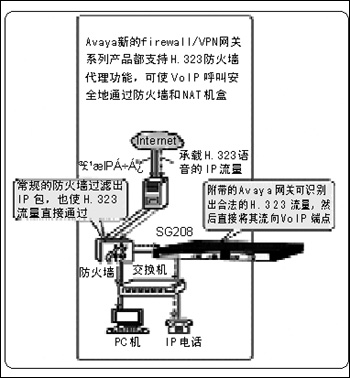 Avaya公司計劃在近期推出幾款網(wǎng)關設備,以支持IP電話呼叫能安全地通過防火墻。其中,包括SG5/5X和MG200系列的firewall/VPN設備。這些新產(chǎn)品的一個重要特性就是對H.323 VoIP協(xié)議的支持,這樣可使VoIP安全、方便地部署在遠程節(jié)點上,而且新的設備也可與現(xiàn)有的firewall/VPN設備協(xié)同工作,或用來建立某個安全基礎設施。同時,H.323代理功能可使Avaya的IP電信呼叫置于Internet上而不受某個公共防火墻的干擾。