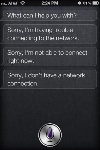 VentureBeat正在與蘋果聯(lián)系以獲取進(jìn)一步的消息,該網(wǎng)站早已致電蘋果客戶服務(wù)中心。盡管他們建議用戶可以重啟WiFi甚至手機(jī),可Siri依然無(wú)法連接到服務(wù)器。據(jù)蘋果客服主管反映,這完全可能是因?yàn)檎麄(gè)網(wǎng)絡(luò)已中斷。
