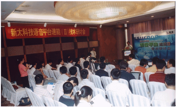 7月23日,新太科技在廣州花園酒店舉行"語(yǔ)音平臺(tái)速能II技術(shù)研討會(huì)"。新太科技執(zhí)行總裁梁平、副總裁何健明,開(kāi)發(fā)中心副經(jīng)理張少文,營(yíng)銷(xiāo)中心國(guó)際業(yè)務(wù)部副總經(jīng)理馬任遠(yuǎn)、產(chǎn)品經(jīng)理黃偉,新太科技合作伙伴Intel公司通訊產(chǎn)品業(yè)務(wù)部戰(zhàn)略客戶(hù)經(jīng)理林競(jìng)宇,新太語(yǔ)音平臺(tái)速能產(chǎn)品核心代理商--廣州納特威科技公司總經(jīng)理黃淡輝,渠道總代理商--深圳意科特實(shí)業(yè)有限公司總經(jīng)理李面換等到會(huì)并作主題發(fā)言!吨袊(guó)計(jì)算機(jī)報(bào)》、《計(jì)算機(jī)世界》、《SP計(jì)算機(jī)產(chǎn)品與流通》、IT168共四家專(zhuān)業(yè)媒體記者到會(huì)采訪。