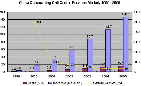 Frost & Sullivan公司研究表明在2000年,中國外包呼叫中心服務(wù)市場價值1700萬美元,共有1600坐席。本座席數(shù)是按照實際工作量來計算的,物理上存在的坐席數(shù)要超過2300個。因為許多坐席是在2000年下半年末才建成投入使用的,并且工作任務(wù)也沒有滿負(fù)荷。