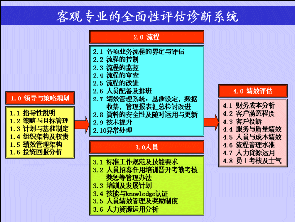 此評估診斷系統以1.0領導與決策規(guī)劃為起始點,作為建立一個以客戶為核心的高質量客戶服務中心的推動根源,并且制定了一個良好的4.0績效評估系統,以確保經營目標與標準質量基準能確實達成,此過程需透過嚴謹的流程設計和高效的人員管理去執(zhí)行這套運營體系。