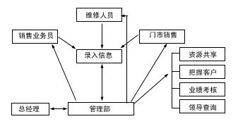 根據(jù)英普的業(yè)務(wù)管理模式,公司將門市銷售、維修部、大客戶部的業(yè)務(wù)管理工作,交由管理部全部管理和協(xié)調(diào),這三個部門將各自與客戶接待、交往過程、工作計劃全部明細(xì)記錄,交由管理部確認(rèn),管理部在保證必要保密的情況下,進(jìn)行工作再分配,同時加強業(yè)務(wù)考核和其他管理職能工作。其業(yè)務(wù)流程如圖1。