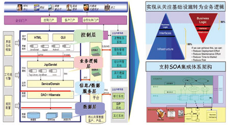 在具體實(shí)現(xiàn)的技術(shù)路線上,產(chǎn)品采用以J2EE為核心的層次化體系結(jié)構(gòu),基于業(yè)務(wù)流程管理和業(yè)務(wù)規(guī)則管理引擎,實(shí)現(xiàn)界面表現(xiàn)層與業(yè)務(wù)邏輯層、業(yè)務(wù)邏輯層與應(yīng)用組件層、應(yīng)用組件層與數(shù)據(jù)訪問層、數(shù)據(jù)訪問層與數(shù)據(jù)存儲(chǔ)層之間的分離,支持統(tǒng)一的權(quán)限管理和認(rèn)證機(jī)制以及統(tǒng)一的企業(yè)門戶接入。(如圖1所示)