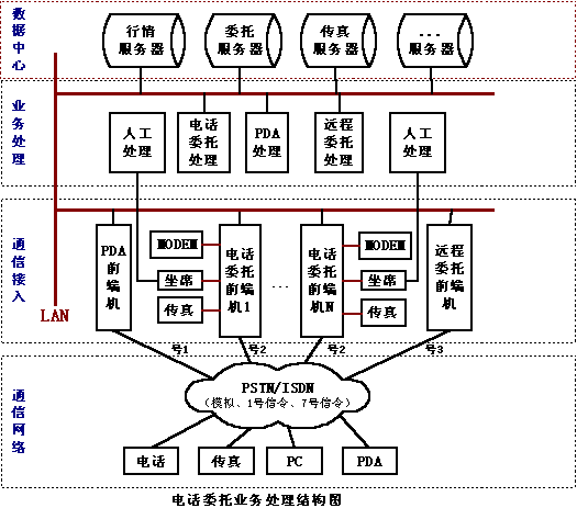 另一種方案是PDA和證券營業(yè)部前端機(實際就是電話委托前端機)采用FSK通訊方式,使用電話委托的通道來完成所有的委托查詢。這種方式的速度快,信息容量大,保密性強,而且營業(yè)部不需單獨申請電話線路,PDA和電話委托線路可動態(tài)分配,使其電話線路得到最大限度的利用。另外,營業(yè)部對外形象也好,只用一個號碼就可讓股民完成電話委托、PDA委托等多種委托方式,給股民帶來了方便。不過這種方式需要得到電話語音卡提供廠商的產(chǎn)品技術(shù)支持,語音卡必須同時支持標準的DTMF和FSK的方式,卡上有充足的能力來處理兩種方式,在語音處理卡的底層驅(qū)動應(yīng)該將電話和PDA的委托區(qū)別開來,目前市場能夠完全支持這種應(yīng)用的只有深圳市東進通訊技術(shù)股份有限公司的產(chǎn)品,東進技術(shù)的新一代PCI系列語音卡數(shù)字卡和模擬卡都完全采用DSP(數(shù)字信號處理器)架構(gòu),卡上有專用DSP來處理DTMF和FSK的收發(fā),是目前PDA委托前端的最好選擇;這種方案還應(yīng)該得到證券電話委托系統(tǒng)的開發(fā)商的支持,在電話委托系統(tǒng)里增加處理PDA委托的功能。目前恒基偉業(yè)的“股靈通”就是采用這種方式。