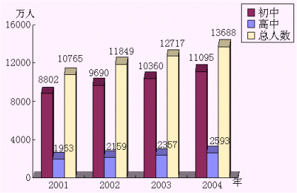 2001年,中國大陸中學(xué)學(xué)生人數(shù)已達(dá)10765萬人,而且學(xué)生人數(shù)還在快速增長。初中學(xué)生人數(shù)以每年6.5%的速度增長,普通高中學(xué)生人數(shù)也以每年10%-11%的速度增長。可以看出,教育市場巨大的潛力和商機(jī)。