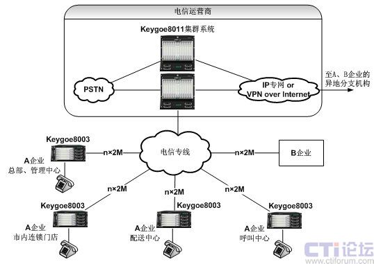 電信運(yùn)營(yíng)商在核心機(jī)房部署由東進(jìn)Keygoe系列多媒體交換機(jī)組成的高性能集群交換機(jī)系統(tǒng),各個(gè)企業(yè)以及各企業(yè)的市內(nèi)分支機(jī)構(gòu)(如管理中心、連鎖門店、配送中心、呼叫中心等)分別配置東進(jìn)Keygoe系列多媒體交換機(jī),并通過(guò)電信運(yùn)營(yíng)企業(yè)的2M專線(E1中繼)方式上聯(lián)到電信運(yùn)營(yíng)商核心機(jī)房的交換機(jī)集群系統(tǒng),組成一個(gè)以集群交換機(jī)系統(tǒng)為核心的星形網(wǎng)絡(luò)(如上圖所示)。所有的市話呼入和呼出都通過(guò)核心節(jié)點(diǎn)和電信運(yùn)營(yíng)商的中繼通道,為連鎖型商業(yè)企業(yè)提供內(nèi)部話音通訊的統(tǒng)一編號(hào)、統(tǒng)一撥號(hào)、統(tǒng)一維護(hù)和管理,企業(yè)對(duì)外公布統(tǒng)一和便于記憶的號(hào)碼,實(shí)現(xiàn)企業(yè)管理、營(yíng)銷和客戶服務(wù)的統(tǒng)一化和規(guī)范化。核心機(jī)房的高性能集群交換機(jī)系統(tǒng)充分考慮冗余備份,如模塊和整機(jī)設(shè)備的雙冗余,從而提高整個(gè)通信平臺(tái)的高可用性和高可靠性。各個(gè)分支的多媒體交換機(jī)具備本地的獨(dú)立工作能力,即使在中繼線路出現(xiàn)故障的情況下,也能正常的工作。同時(shí),Keygoe系列多媒體交換機(jī)集成了7號(hào)信令、會(huì)議、傳真、語(yǔ)音等豐富的多媒體處理資源,可以為用戶開發(fā)靈活多樣的智能業(yè)務(wù)和增值業(yè)務(wù),豐富了系統(tǒng)的應(yīng)用。