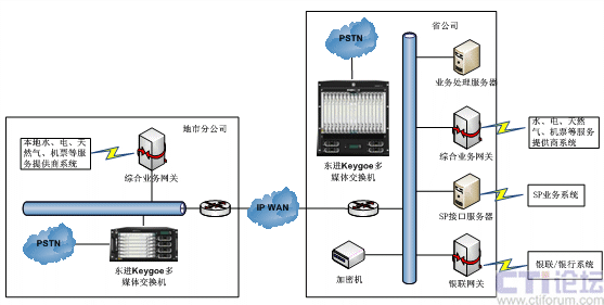 東進固網(wǎng)支付平臺通過IP專網(wǎng)將省公司和各地市公司的系統(tǒng)連接起來,采取二級地市分公司數(shù)據(jù)接入、運營商總部集中處理的拓撲架構,實現(xiàn)業(yè)務的全省統(tǒng)一運營。各地市公司分別建設一套接入平臺,業(yè)務處理服務器統(tǒng)一建設在運營商總部。各地市的水、電、煤氣、電信、彩票等外部系統(tǒng)通過在本地建設的綜合業(yè)務網(wǎng)關與業(yè)務系統(tǒng)對接,支付業(yè)務統(tǒng)一通過運營商總部所在地銀聯(lián)轉(zhuǎn)到各地銀聯(lián)進行。