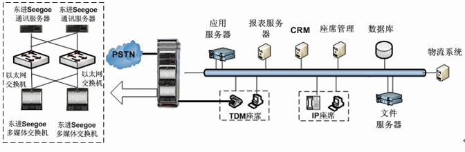 東進(jìn)技術(shù)電視購物呼叫中心解決方案,采用東進(jìn)技術(shù)Seegoe系列多媒體交換機(jī)和多媒體服務(wù)器搭建系統(tǒng)平臺。東進(jìn)Seegoe系列多媒體交換機(jī),具有豐富的媒體資源和強(qiáng)大的處理能力,并提供功能模塊的N+1全冗余備份,滿足了高負(fù)荷、大并發(fā)和關(guān)鍵業(yè)務(wù)的可靠運營。以Seegoe多媒體交換機(jī)、Seegoe通訊服務(wù)器為核心的面向業(yè)務(wù)流程的呼叫中心平臺在媒體交換層以全新的IP架構(gòu)實現(xiàn)網(wǎng)絡(luò)融合、應(yīng)用融合和業(yè)務(wù)融合。如下圖所示: