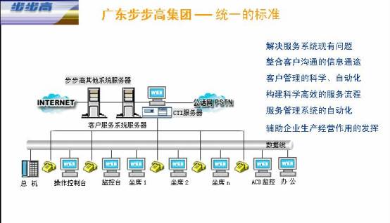 步步高呼叫中心最有效益的應(yīng)用就是在客戶服務(wù)管理系統(tǒng)中發(fā)揮前端強有力的支持作用,它不但給客戶提供高級的交互式服務(wù),而且為業(yè)界確定了新的客戶服務(wù)滿意標(biāo)準(zhǔn)。