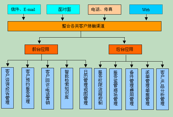 后臺客服應(yīng)用子系統(tǒng)能夠很方便地與前臺呼叫中心整合,以更全面的功能,提供一流的客戶服務(wù)。整個后臺系統(tǒng)包括一系列完善的功能:客戶咨詢/投訴管理、客戶預(yù)約服務(wù)受理、客戶回訪/電話營銷、智能檢索知識庫、日歷管理/視圖管理、服務(wù)權(quán)限/流程控制、服務(wù)監(jiān)管/商場管理、備件管理/費用管理、派單管理/單據(jù)管理、客戶/產(chǎn)品分析管理。