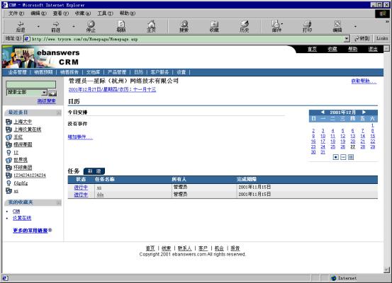 星際(杭州)網(wǎng)絡(luò)技術(shù)有限公司(www.ebanswers.com)研發(fā)的Ebanswers eCRM是中國第一套基于新一代網(wǎng)絡(luò)標(biāo)準(zhǔn)語言――XML的客戶關(guān)系管理系統(tǒng),整個系統(tǒng)提供了完善的企業(yè)級客戶關(guān)系全面解決方案,包含可無縫整合又可獨立運行的三個功能組件:銷售,營銷,服務(wù)流程自動化軟件系統(tǒng);客戶溝通集成信息化方案;深層商業(yè)智能分析。