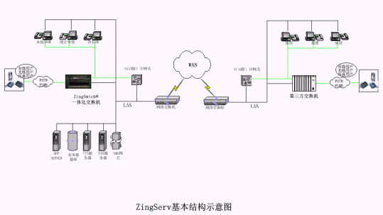 硬件:中心點有ZingSwitch®,O口網(wǎng)關和內(nèi)線卡,VPN動態(tài)注冊服務器和VPN設備,或GK服務器。座席端配置S口網(wǎng)關,根據(jù)需求配置相應的VPN設備。