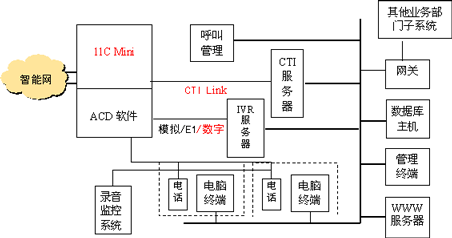 本方案的主要應(yīng)用平臺包括:Meridian 1 Option 11 mini ISDN數(shù)字程控交換機(配ACD軟件包)、交互式語音應(yīng)答系統(tǒng)(IVR)、計算機電話集成系統(tǒng)(CTI)、座席、呼叫管理系統(tǒng)、錄音監(jiān)控系統(tǒng)、數(shù)據(jù)庫服務(wù)器、應(yīng)用網(wǎng)關(guān)、WWW服務(wù)器、網(wǎng)絡(luò)系統(tǒng),其邏輯結(jié)構(gòu)下圖所示。