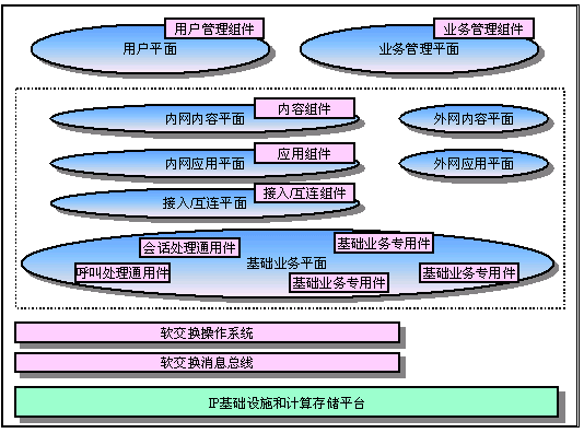 從結(jié)構(gòu)上看,業(yè)務(wù)驅(qū)動的軟交換平臺是一個復(fù)雜的多域多層組件平臺。一個電信業(yè)務(wù)的實現(xiàn)是對平臺上的組件的組裝過程。業(yè)務(wù)驅(qū)動的軟交換平臺上的組件分為用戶平面、基礎(chǔ)業(yè)務(wù)平面、接入/互連/移動控制平面、應(yīng)用平面、內(nèi)容平面和業(yè)務(wù)管理平面。用戶平面的組件負責(zé)維護用戶的注冊信息、位置信息、狀態(tài)信息、業(yè)務(wù)信息和業(yè)務(wù)使用信息;A(chǔ)業(yè)務(wù)平面的組件分為三大類型:電路基礎(chǔ)業(yè)務(wù)、包交換基礎(chǔ)業(yè)務(wù)和多媒體交換基礎(chǔ)業(yè)務(wù)。每個基礎(chǔ)業(yè)務(wù)分成傳輸層、承載層、媒體層、呼叫處理層和業(yè)務(wù)層,其中的控制包括了對各層功能的控制協(xié)議和層間交互的控制協(xié)議。接入/互連/移動控制平面中包含了對各種接入網(wǎng)絡(luò)的控制、對互聯(lián)網(wǎng)絡(luò)的控制和對移動性的控制協(xié)議,也分成傳輸層、承載層、媒體層、呼叫處理層和業(yè)務(wù)層的控制組件。應(yīng)用平面的組件分為三種類型,基于傳統(tǒng)智能網(wǎng)(IN,