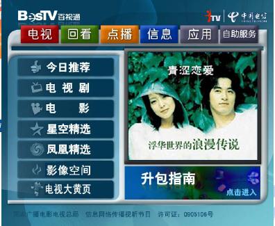 上海IPTV點(diǎn)播節(jié)目達(dá)3000小時(shí),包括電影、電視劇、音樂娛樂、紀(jì)實(shí)節(jié)目、少兒、體育以及教育等欄目。點(diǎn)播節(jié)目改變了“你播我看”的電視被動(dòng)接受方式,讓用戶可以根據(jù)自己的喜好來(lái)選擇喜愛的個(gè)性化節(jié)目,大大提高了用戶的喜愛度。值得一提的是,當(dāng)收看電影中途退出的時(shí)候,系統(tǒng)提供了“書簽”功能,下一次收看時(shí),便可以從書簽處繼續(xù),方便用戶使用和體驗(yàn)。另外,系統(tǒng)提供的“搜索”功能也讓百姓眼前一亮,尋找自己喜愛的影片就更方便了。