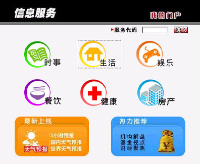在上海IPTV提供的業(yè)務(wù)中,信息服務(wù)也是眾多用戶喜聞樂見的一項(xiàng)業(yè)務(wù),內(nèi)容覆蓋廣泛。它提供了時(shí)事、生活、娛樂、餐飲、健康、房產(chǎn)等信息,其中“時(shí)事”一欄呈現(xiàn)了新浪上海熱線實(shí)時(shí)傳遞的全球最新新聞資訊,讓老百姓“手握遙控器,便知天下事”,“健康”一欄更是一網(wǎng)打盡上海地區(qū)醫(yī)療機(jī)構(gòu)的信息資訊,特色專科搜索為用戶提供便捷的醫(yī)療信息服務(wù),“房產(chǎn)”中上海地區(qū)各類二手房產(chǎn)訊息一應(yīng)俱全,價(jià)格、地段、房型等應(yīng)有盡有。