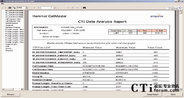如果響應(yīng)時間超過設(shè)定的預(yù)置值(閥值),或者發(fā)現(xiàn)任何其它問題時,Hammer可以把這個錯誤和它的位置記錄在數(shù)據(jù)庫中,然后實時顯示測試結(jié)果。Hammer可以模擬呼叫流程中的任何一個方面,包括DTMF按鍵音可變信息的記錄或者是為測試支持語音識別系統(tǒng)而播放大量的語音文件。Hammer專利的語音提示識別能力更可以自動檢驗在IVR和ACD/PBX系統(tǒng)中是否正確播放語音提示。