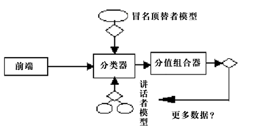 下圖說(shuō)明了Nuance軟件的處理流程。語(yǔ)音前端處理后,分類(lèi)器將講話(huà)者的語(yǔ)音特性和有關(guān)的講話(huà)者和冒名頂替者模型進(jìn)行比較,產(chǎn)生分值。