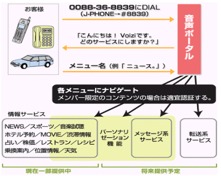 答:VOIZI是通過(guò)電話即可上網(wǎng),各種各樣的情報(bào)檢索的日本第一個(gè)聲音上網(wǎng)的Site。只要用家里的電話,或是J-Phone,在任何地方任何時(shí)候都可以簡(jiǎn)單上網(wǎng),得到自己想要的情報(bào)信息。
