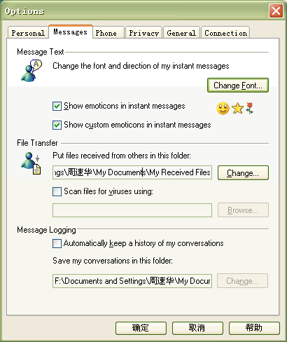 Messenger 6.0必須在個(gè)人選項(xiàng)中進(jìn)行設(shè)置后才可以自動保存聊天記錄,默認(rèn)是不支持的。