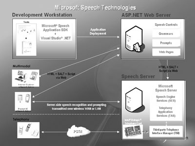 上圖中的Speech Server就是微軟的Web語音平臺,可以看到它連接起了電話網(wǎng)絡(luò)(PSTN)以及Web Server。