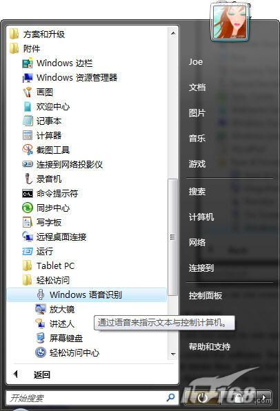 如圖2所示,你也可以在“所有程序|附件|輕松訪問”菜單下找到語音識(shí)別特性。圖2 在“輕松訪問”菜單中,你也能看到“語音識(shí)別”