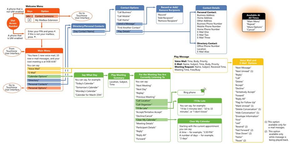 允許用戶通過電話處理他們的消息和日歷數(shù)據(jù)(包括收聽、轉(zhuǎn)發(fā)和回復電子郵件,以及發(fā)出、更新或響應(yīng)會議請求)。用戶可以標記消息以便跟蹤、跳到下一封未讀郵件、隱藏或刪除對話,甚至查找來自特定用戶的消息,這一切全都使用語音導航或標準按鍵式鍵盤來完成。