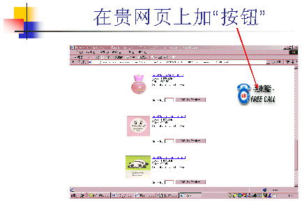 簡(jiǎn)單地說,就是當(dāng)有客戶瀏覽到網(wǎng)上購(gòu)物的網(wǎng)頁(yè)時(shí),若有任何疑問或想立即購(gòu)買,只要點(diǎn)擊在網(wǎng)頁(yè)上的“按鈕”鍵,就可以直接接通到網(wǎng)站的客服中心,實(shí)現(xiàn)即時(shí)地語(yǔ)音互動(dòng)。也不需再像以前那樣發(fā)E-MAIL或撥電話號(hào)碼了。效果可謂是立竿見影。(如圖示)