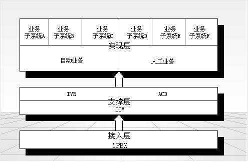 支撐層由ICM、IVR、ACD以及Web協(xié)同、座席管理、傳真、錄音管理、業(yè)務(wù)流程生成等子系統(tǒng)組成。形成獨立于用戶業(yè)務(wù)的通用支撐系統(tǒng),其核心是ICM - 智能呼叫管理。