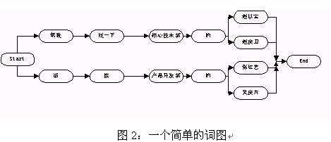 在語音識別中,語言模型是用來指導引擎進行語音識別的,它限定了一個識別引擎所能表達的語句類型。在我們常用的圖搜索引擎中,語言模型是通過語法來表示的,語法是由一系列表示某個領域的語言表達方式的規(guī)則組成的(語法的具體書寫規(guī)則見引擎使用說明書)。這些規(guī)則會被被轉(zhuǎn)換成詞圖的形式然后用來指導語音的識別。所謂的詞圖是指由詞作為節(jié)點的一個圖,從該圖的開始節(jié)點到末尾節(jié)點的任一條路徑都是一個有效合法的句子。圖2給出了一個簡單的詞圖。