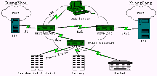 。。VocaSwitch-B有兩個(gè),一個(gè)做GK和GW,通過1個(gè)E1與廣州的普通電話網(wǎng)連接;一個(gè)做GW,通過8個(gè)E1與香港的普通電話網(wǎng)連接。香港的MEVD注冊(cè)到廣州的VocaSwitch-B,其它GW也注冊(cè)到廣州的VocaSwitch-B。這樣就構(gòu)成了IP電話網(wǎng)。
