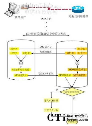 1.方案1的認證方式最為簡單實用,也非常安全。其中Radius標準提供了兩種可選的身份認證方法:口令驗證協(xié)議PAP(Password Authentication Protocol,PAP)和質(zhì)詢握手協(xié)議(Challenge Handshake Authentication Protocol,CHAP)。如果雙方協(xié)商達成一致,也可以不使用任何身份認證方法。質(zhì)詢握手協(xié)議認證(CHAP)相比口令驗證協(xié)議認證(PAP)安全性更高,因為CHAP不在線路上發(fā)送明文密碼,而是發(fā)送經(jīng)過摘要算法加工過的隨機序列,也被稱為"挑戰(zhàn)字符串".如下圖所示。