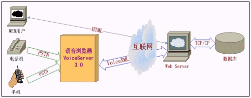 聲軟科技的語音網(wǎng)站系統(tǒng)《XVoice Portal 3.0》的核心系統(tǒng)是本公司的拳頭產(chǎn)品VoiceServer 3.0。VoiceServer 3.0和企業(yè)互聯(lián)網(wǎng)站上的Web服務(wù)器組成企業(yè)的語音門戶網(wǎng)站。只需在網(wǎng)站上存放相應(yīng)的VoiceXML頁面,客戶撥打連接VoiceServer的接入電話號碼,VoiceServer利用語音瀏覽的功能播放網(wǎng)站上的內(nèi)容,系統(tǒng)就能運(yùn)轉(zhuǎn)起來,為客戶提供語音服務(wù)。以下是系統(tǒng)結(jié)構(gòu)圖: