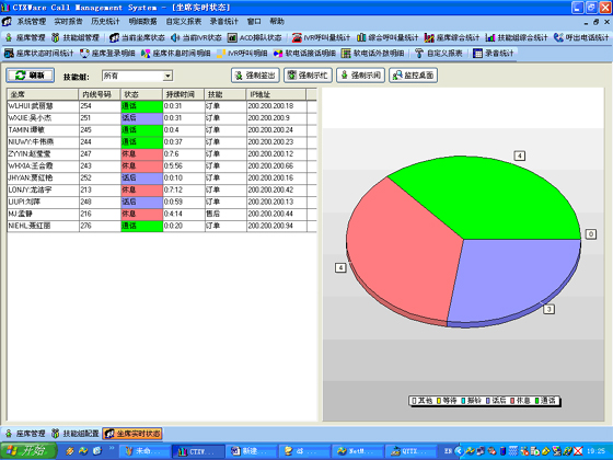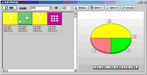 當(dāng)前座席狀態(tài):能夠提供座席的狀態(tài)表示,狀態(tài)持續(xù)時(shí)間,對(duì)應(yīng)的技能組,對(duì)應(yīng)的分機(jī)號(hào)碼,對(duì)應(yīng)的IP地址等信息?梢詫(duì)任何一個(gè)座席進(jìn)行強(qiáng)制簽出、強(qiáng)制示忙、強(qiáng)制示閑操作。可以對(duì)任意座席進(jìn)行屏幕監(jiān)控操作(無需任何第三方軟件)。