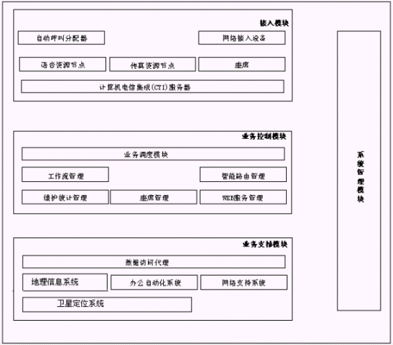 博宇110自動(dòng)報(bào)警與指揮調(diào)度系統(tǒng)的邏輯結(jié)構(gòu)由以下四大模塊構(gòu)成:接入模塊、業(yè)務(wù)控制模塊、業(yè)務(wù)支撐模塊、系統(tǒng)管理模塊,如下圖所示。其中,接入模塊、業(yè)務(wù)控制模塊和業(yè)務(wù)支撐模塊構(gòu)成了整個(gè)系統(tǒng)軟件體系結(jié)構(gòu)的三個(gè)層次,而系統(tǒng)管理模塊則橫貫始終。
