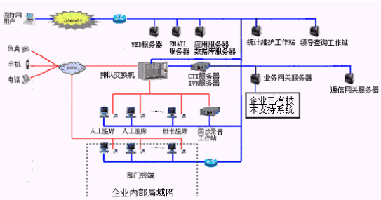 網(wǎng)上服務(wù)系統(tǒng):與INTENET結(jié)合,接受來(lái)自網(wǎng)上的呼叫請(qǐng)求,提高服務(wù)和營(yíng)銷的質(zhì)量和效率。