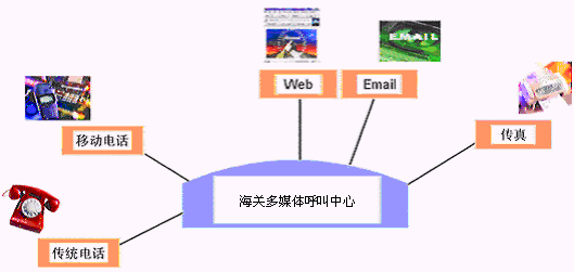 客戶利用電話、傳真、電子郵件、因特網(wǎng)、手機(jī)等撥打某一特服號碼(如9xxxx)進(jìn)入海關(guān)多媒體呼叫中心系統(tǒng),本系統(tǒng)依托海關(guān)緝私相關(guān)的MIS系統(tǒng)、OA度系統(tǒng)等各類業(yè)務(wù)技術(shù)支持系統(tǒng)和網(wǎng)絡(luò)系統(tǒng),通過自動語音服務(wù)或人工受理等方式全天24小時(shí)不間斷地為客戶提供各種服務(wù)。