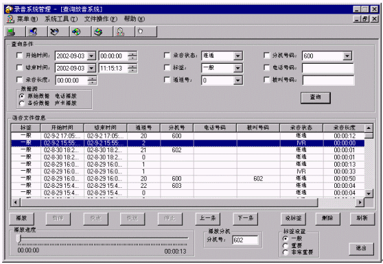 對(duì)查詢出來的聲音文件,可以選定一個(gè)或多個(gè)通過電話或聲卡播放。