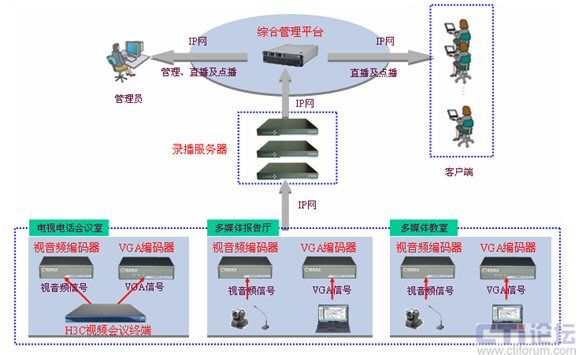 對于學校經常進行學術報告的錄播,可以將多媒體報告廳的視頻和音頻輸入到視音頻編碼器上,將電腦的VGA輸入到VGA編碼器上,視音頻編碼器和VGA編碼器可以將接入的信號進行編碼,通過網絡傳給錄播服務器進行信號處理、整合,最終傳輸到綜合管理平臺上。