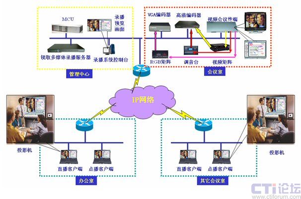 如圖所示:多媒體錄播服務(wù)器放置在管理中心,高清編碼器(采集高清視頻及聲音)及VGA編碼器(采集雙流信號)放置在會議室,客戶端可以是網(wǎng)絡(luò)內(nèi)的任意一臺計算機(jī)。整個系統(tǒng)簡單明了,分布靈活,部署簡單,系統(tǒng)只要連接了信號線,配置了IP地址即可投入使用,無須專業(yè)布線。各部分配置如下: