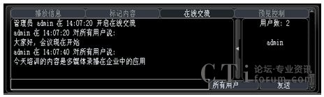 系統(tǒng)增加了多方文字互動(dòng)交流功能,在線交流功能可以選擇給所有人員發(fā)送消息,也可以選擇給某一特定人員發(fā)送。這樣在會議或培訓(xùn)的過程中,管理員可以選擇性的提出相應(yīng)的問題給相關(guān)人員,考核相關(guān)人員的培訓(xùn)效果;其他人員也可以將會議或培訓(xùn)過程中遇到的疑問、難點(diǎn)及時(shí)的反應(yīng)給管理員進(jìn)行解答,增強(qiáng)會議或培訓(xùn)的成效。