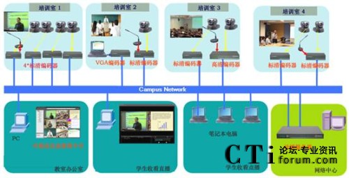 在南洋理工的商學(xué)院中有一個培訓(xùn)中心,培訓(xùn)中心中有4個培訓(xùn)課室。 商學(xué)院的老師們希望可以把這4培訓(xùn)課室中的培訓(xùn)課程錄制下來,并可以同時直播到其它教室。老師可以監(jiān)控這4個培訓(xùn)課室的培訓(xùn)情況。學(xué)生可以使用PC通過校園網(wǎng)收看到實時的培訓(xùn)情況,及培訓(xùn)后的回放他們可能錯過了的培訓(xùn)。系統(tǒng)可與NTU現(xiàn)有的E_learning系統(tǒng)無縫融合,為為豐富E_learning的課件資源提供低成本、高效率的制作手段。同時系統(tǒng)應(yīng)該便于維護(hù)及用戶界面友好,而且便于以后的擴(kuò)容。因培訓(xùn)室的功能差異,每一間培訓(xùn)室內(nèi)所需記錄的信號類型及數(shù)量均不相同,要求系統(tǒng)能夠進(jìn)行匹配和適應(yīng)。