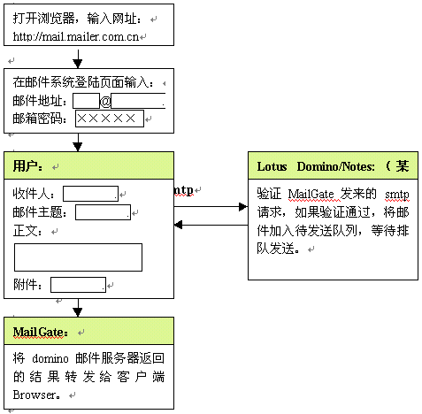 金笛郵件網(wǎng)關(guān)完全基于B/S架構(gòu)的設(shè)計(jì),使得郵件收發(fā)、管理都是基于瀏覽器完成,客戶(hù)端只要打開(kāi)IE瀏覽器即可,無(wú)需做任何設(shè)置,大大方便了用戶(hù)。也就是說(shuō),在城域網(wǎng)任一節(jié)點(diǎn),都可以通過(guò)內(nèi)部域名(DNS)訪(fǎng)問(wèn)郵件網(wǎng)關(guān),然后通過(guò)郵件網(wǎng)關(guān)與用戶(hù)所在的domino郵件服務(wù)器通訊,將郵件主題、郵件內(nèi)容顯示在web頁(yè)面上。金笛?郵件網(wǎng)關(guān)的具體工作流程如下: