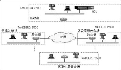 此次應用的視頻會議終端位于東城區(qū)政府所轄范圍內的各重要單位,通過H.323網絡召開內部工作會議,從而方便地實現(xiàn)實時交互式遠程會議,會議電視系統(tǒng)設計使用速率支持1.5Mbps,控制方式采用全網星型集中式控制方式。