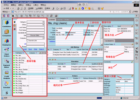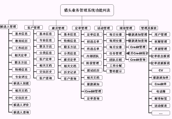 運(yùn)行于瀏覽器、跨地域信息公享;人力資源信息專業(yè)、覆蓋全面;系統(tǒng)功能強(qiáng)大、操作簡單方便;靈活配置,可擴(kuò)展性強(qiáng);復(fù)雜的業(yè)務(wù)關(guān)聯(lián)性及專業(yè)的業(yè)務(wù)報表。全部采用模塊化設(shè)置,包含了候選人管理、客戶管理、雇員管理、定單管理、活動管理、績效管理、統(tǒng)計報表和系統(tǒng)維護(hù)管理等模塊,以及幾十項具體業(yè)務(wù)功能細(xì)節(jié)。系統(tǒng)功能模塊明細(xì)表如下: