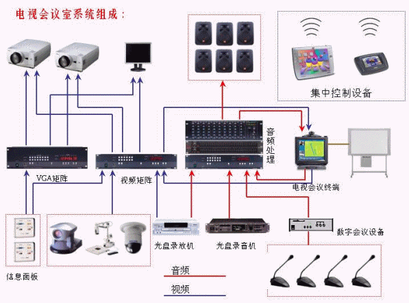 由于電視會議室的整個系統(tǒng)操作涉及多個子系統(tǒng)的協(xié)調動作,因此,集中控制系統(tǒng)的加入變得極為必要。