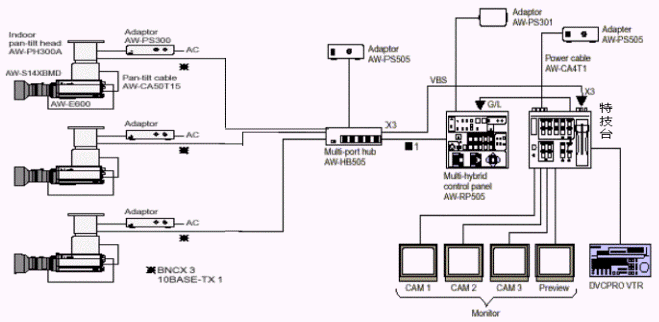 移動攝象機采用的松下E300攝像機是一款廣播級攝像機,水平分辨率:800線,最小照度:1.5lux信噪比:60dB。我公司在國家郵政總局直播室成功應用過此款攝像機,效果非常好。系統(tǒng)連接圖如下