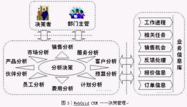 WebGrid CRM是基于CRM理念而設計的,它將面向客戶的所有業(yè)務進行整合,提供了統(tǒng)一的業(yè)務平臺,并使用工作流技術將各種業(yè)務緊密聯(lián)系起來。WebGrid CRM 的功能可以歸納為三個方面:1) 對銷售、營銷和客戶服務三部分業(yè)務流程的信息化;2) 與客戶進行溝通所需要的手段(如電話、傳真、網(wǎng)絡、Email等)的集成和自動化處理;3) 對上面兩部分功能所積累下的信息進行的加工處理,產(chǎn)生客戶智能,為企業(yè)的戰(zhàn)略戰(zhàn)術的決策作支持。見下圖所示: